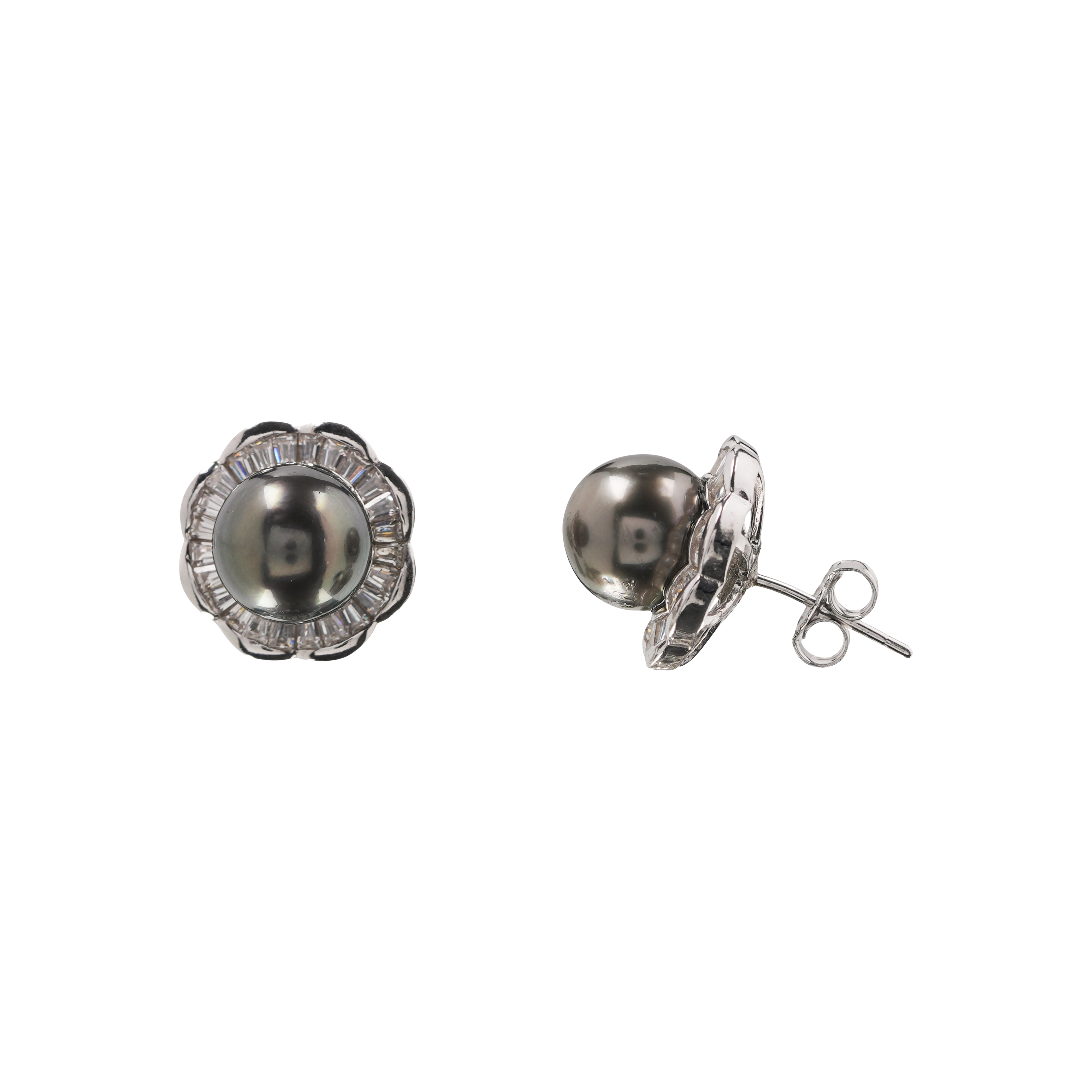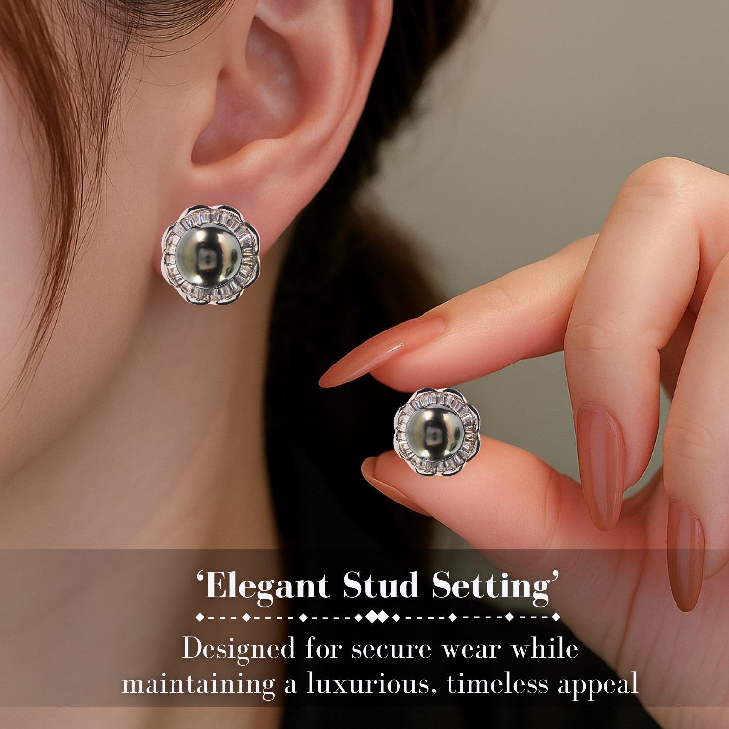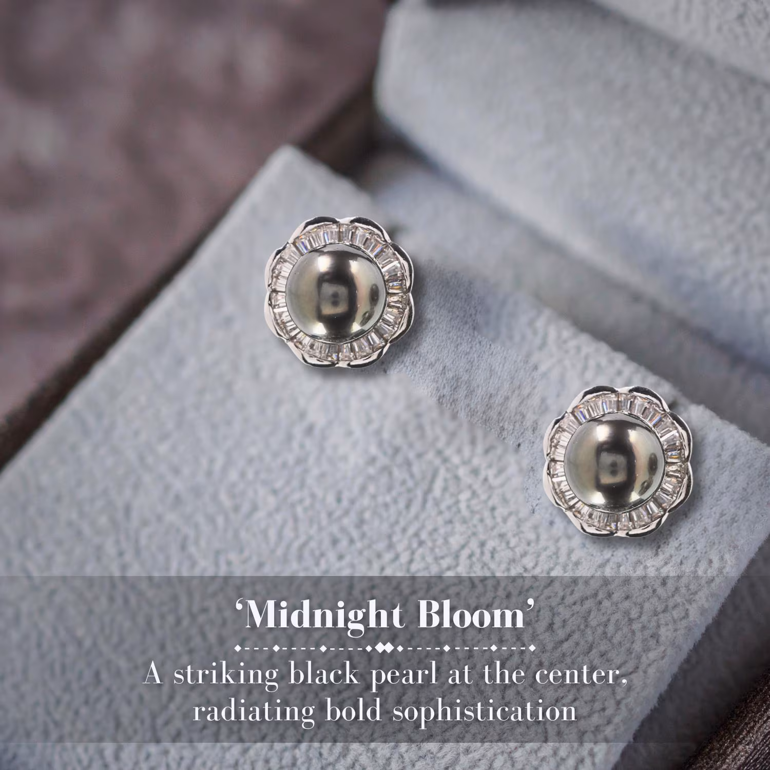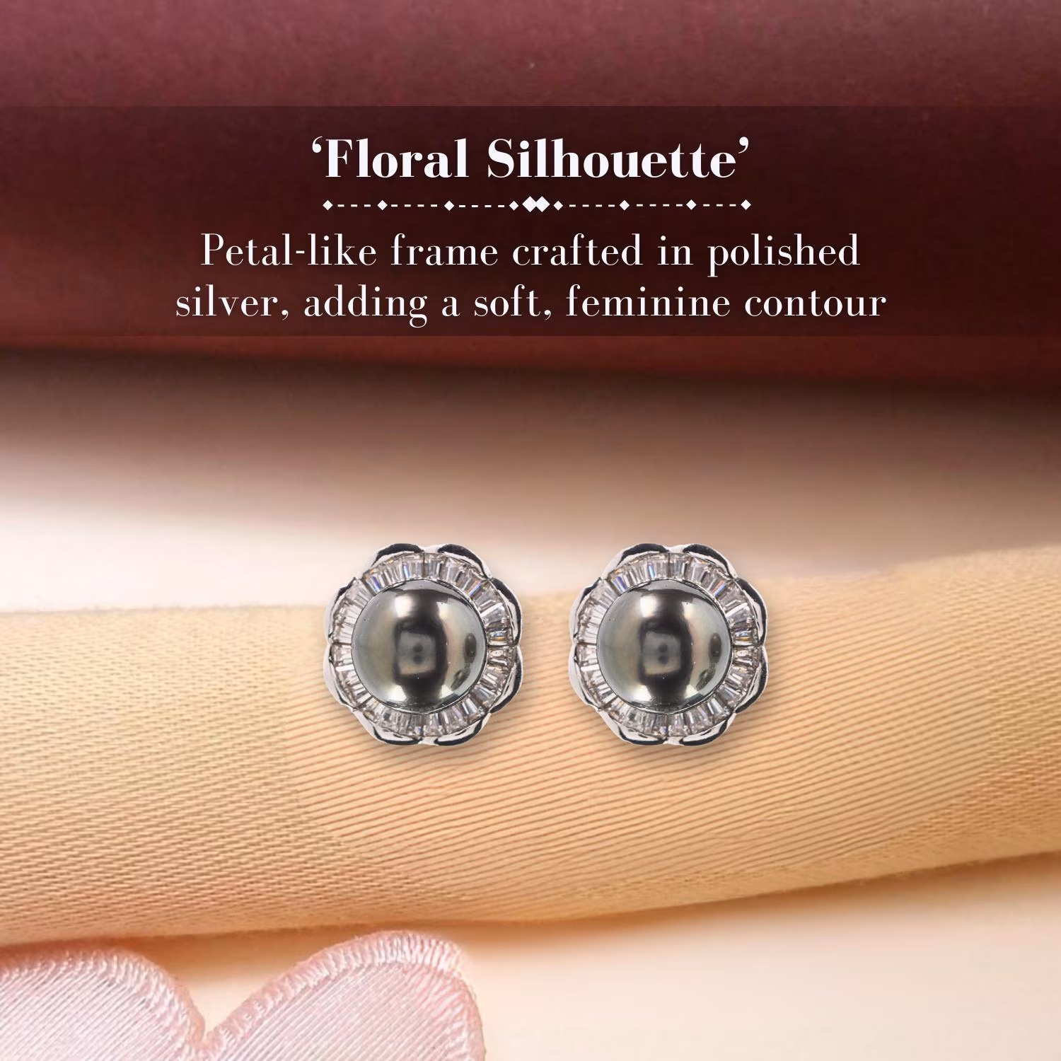 Black Pearl Stud Earrings, Floral Crystal Halo Studs, Elegant Vintage Style Jewellery, Classic Everyday Earrings, Gift for Her