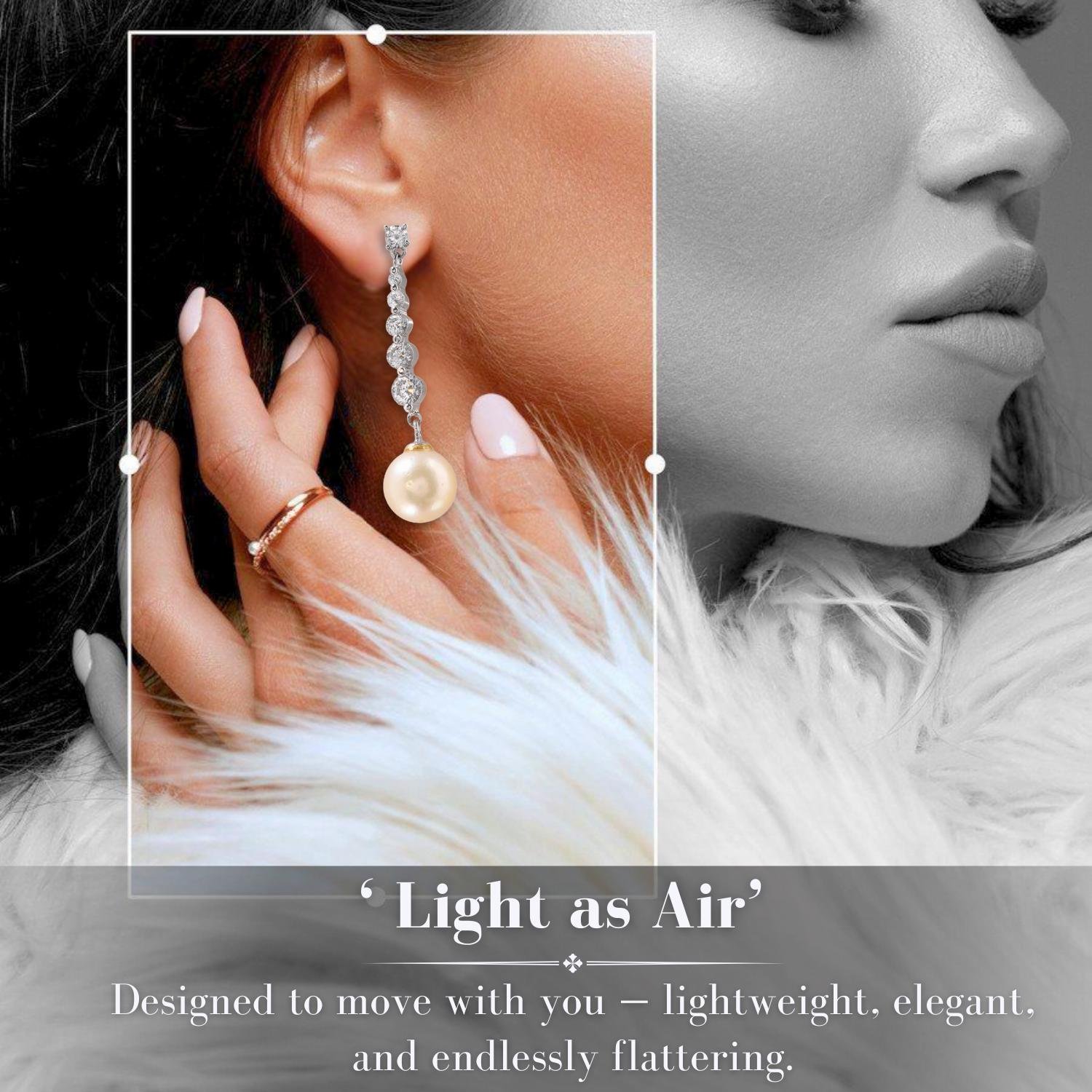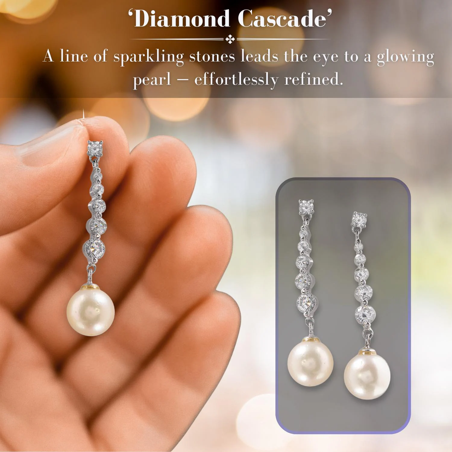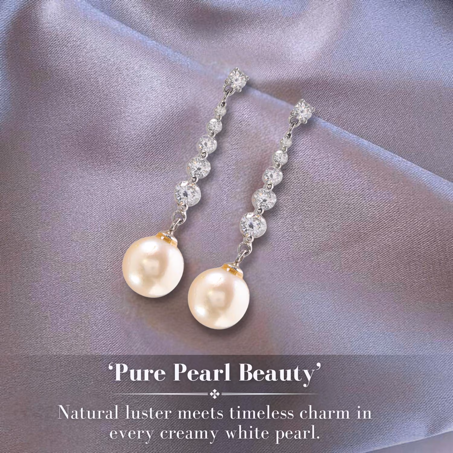 Classic Long Pearl Drop Earrings, Silver Cubic Zirconia Dangle Earrings, Timeless Bridal & Evening Jewelry for Women