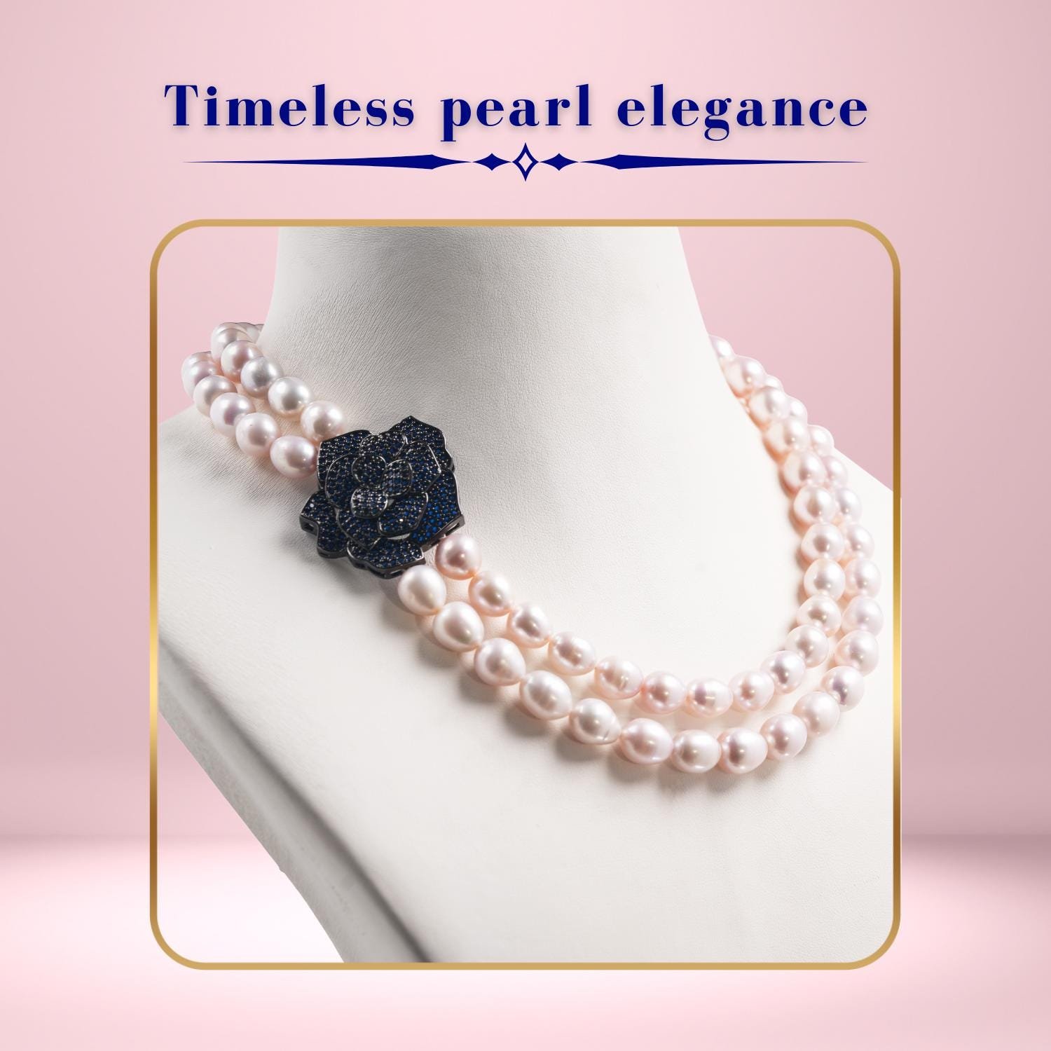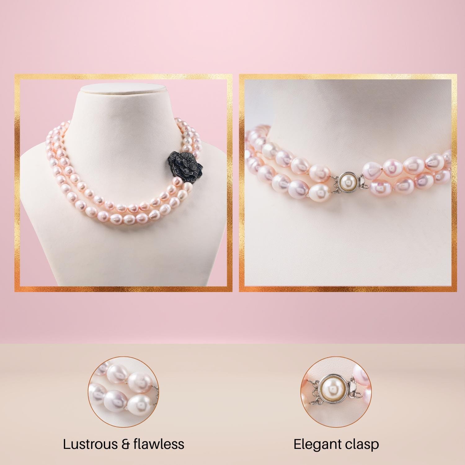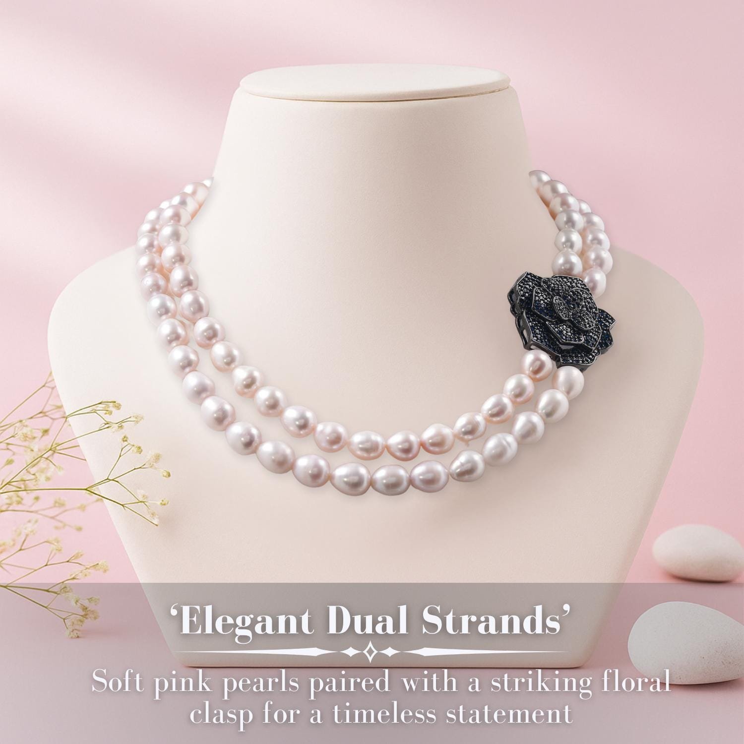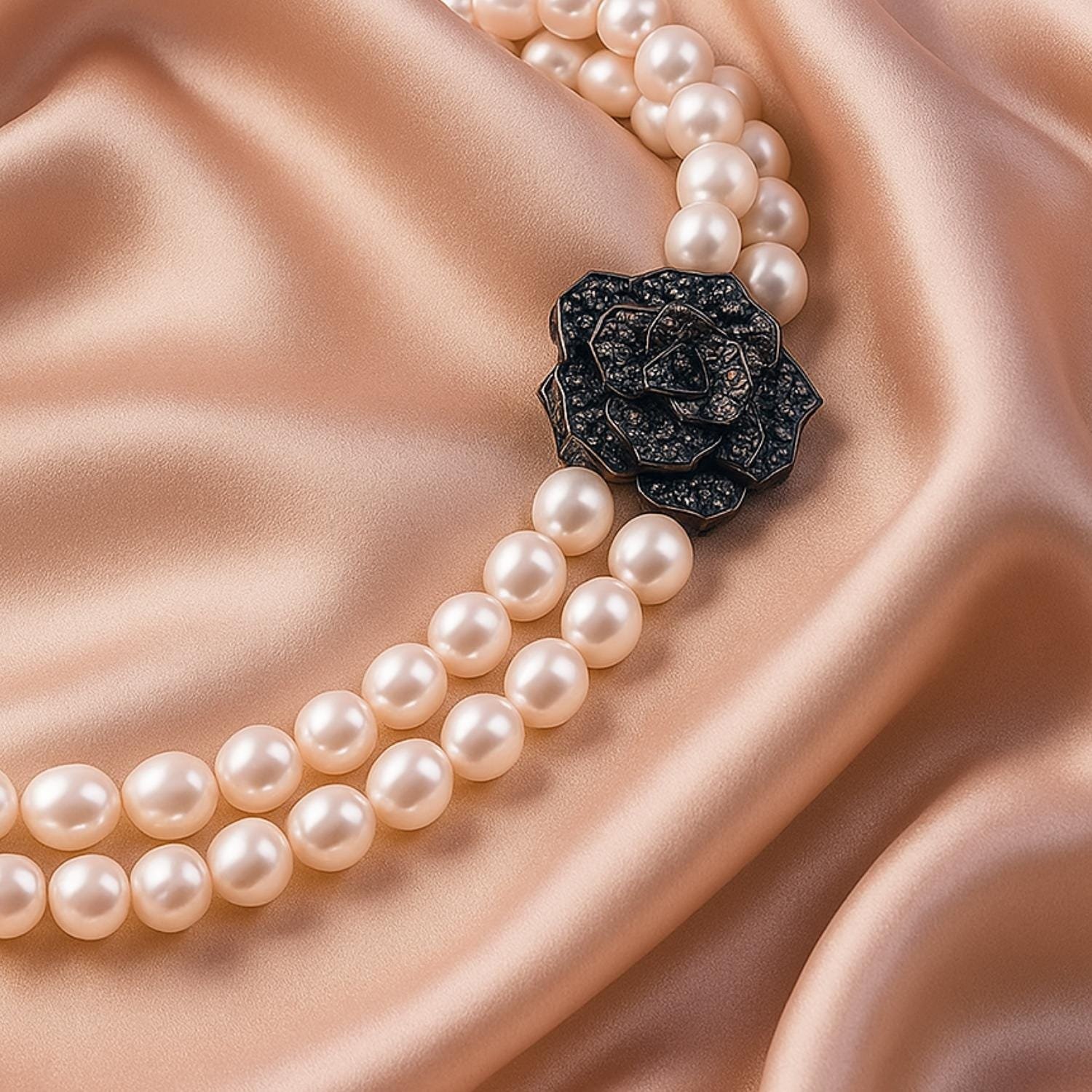 Double Strand Pearl Necklace with Black Rose Clasp, Elegant Statement Jewellery, Classic Bridal & Evening Wear Necklace