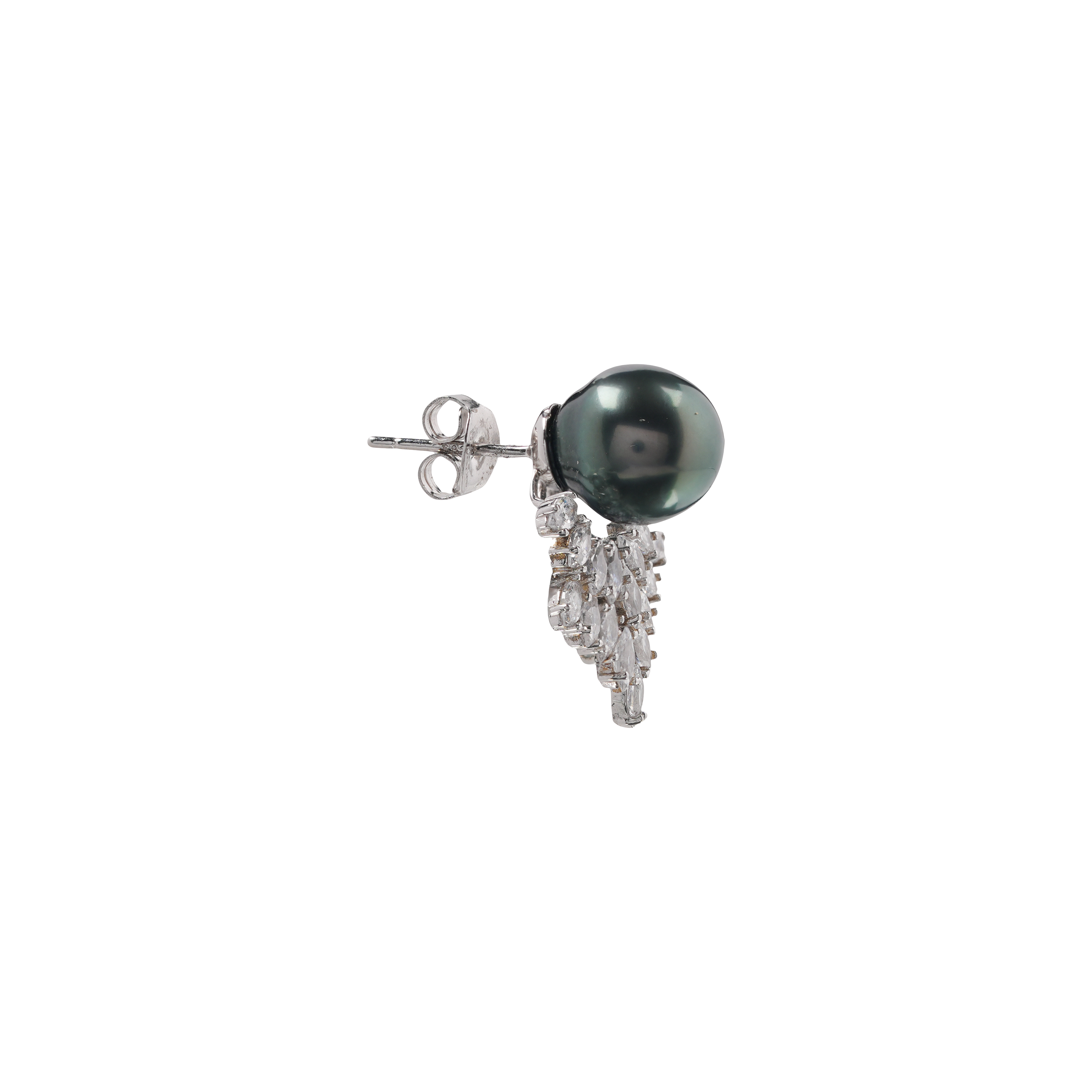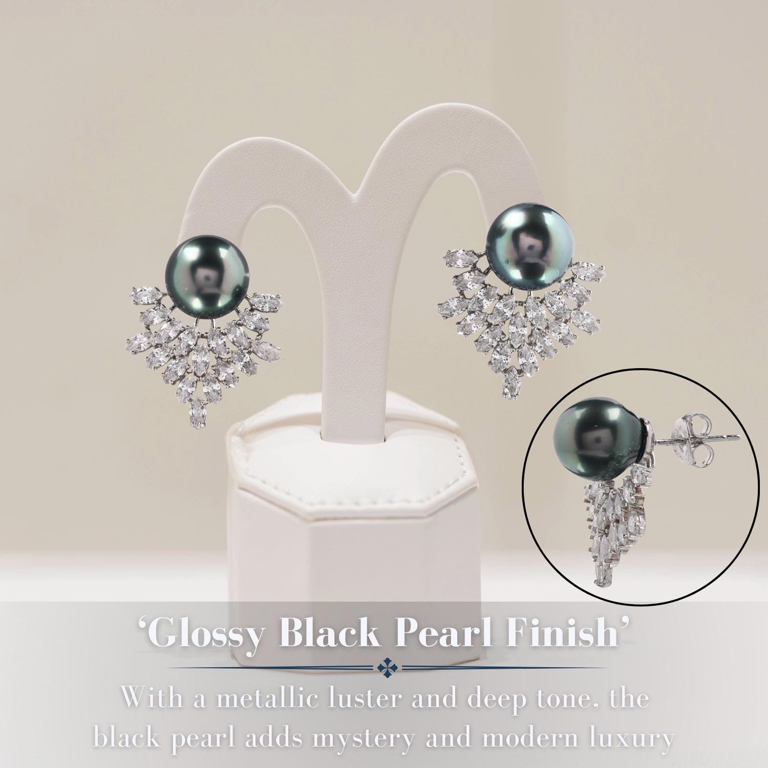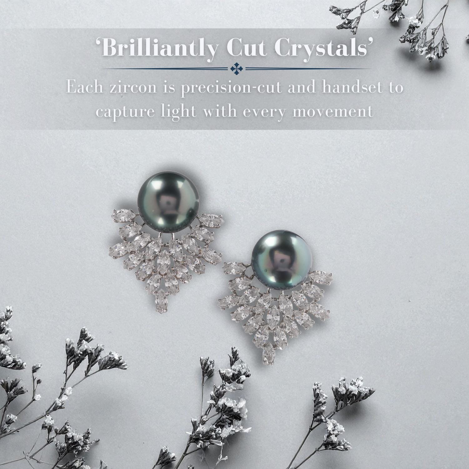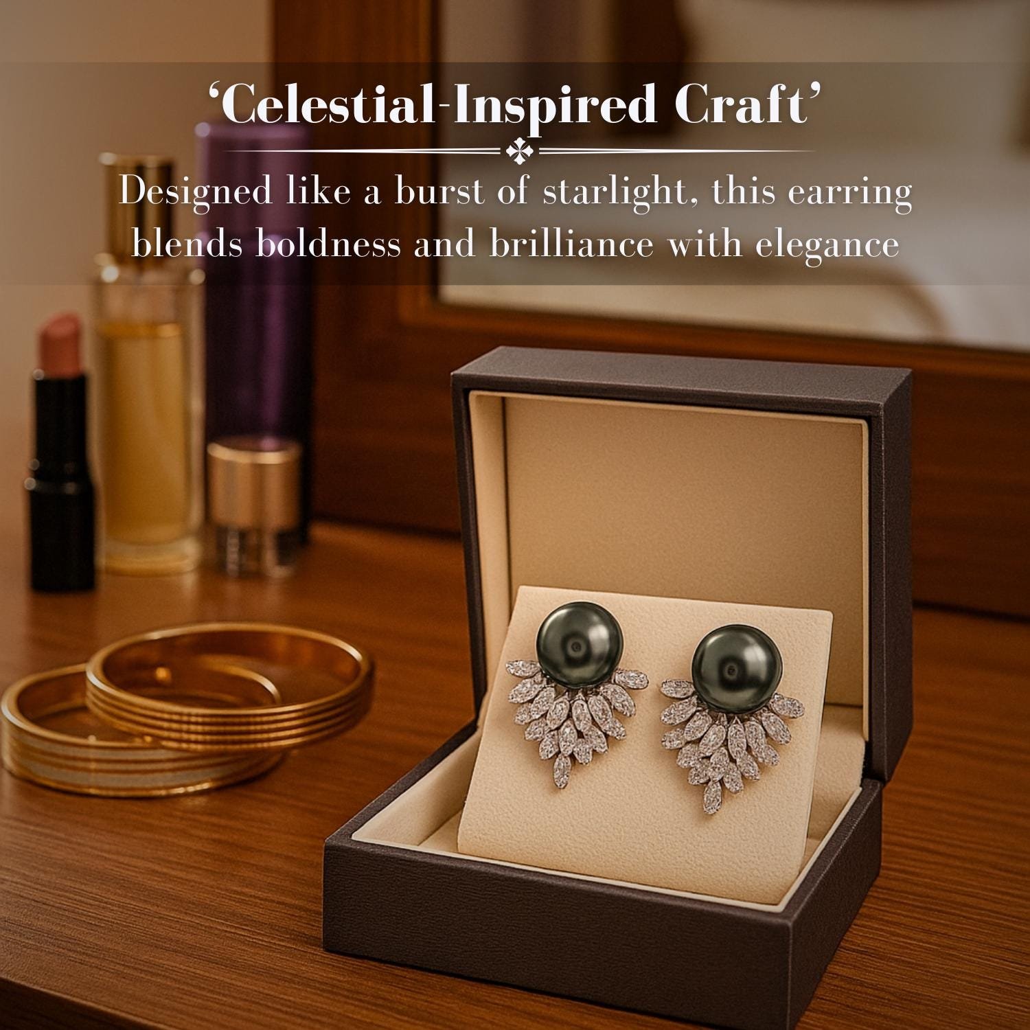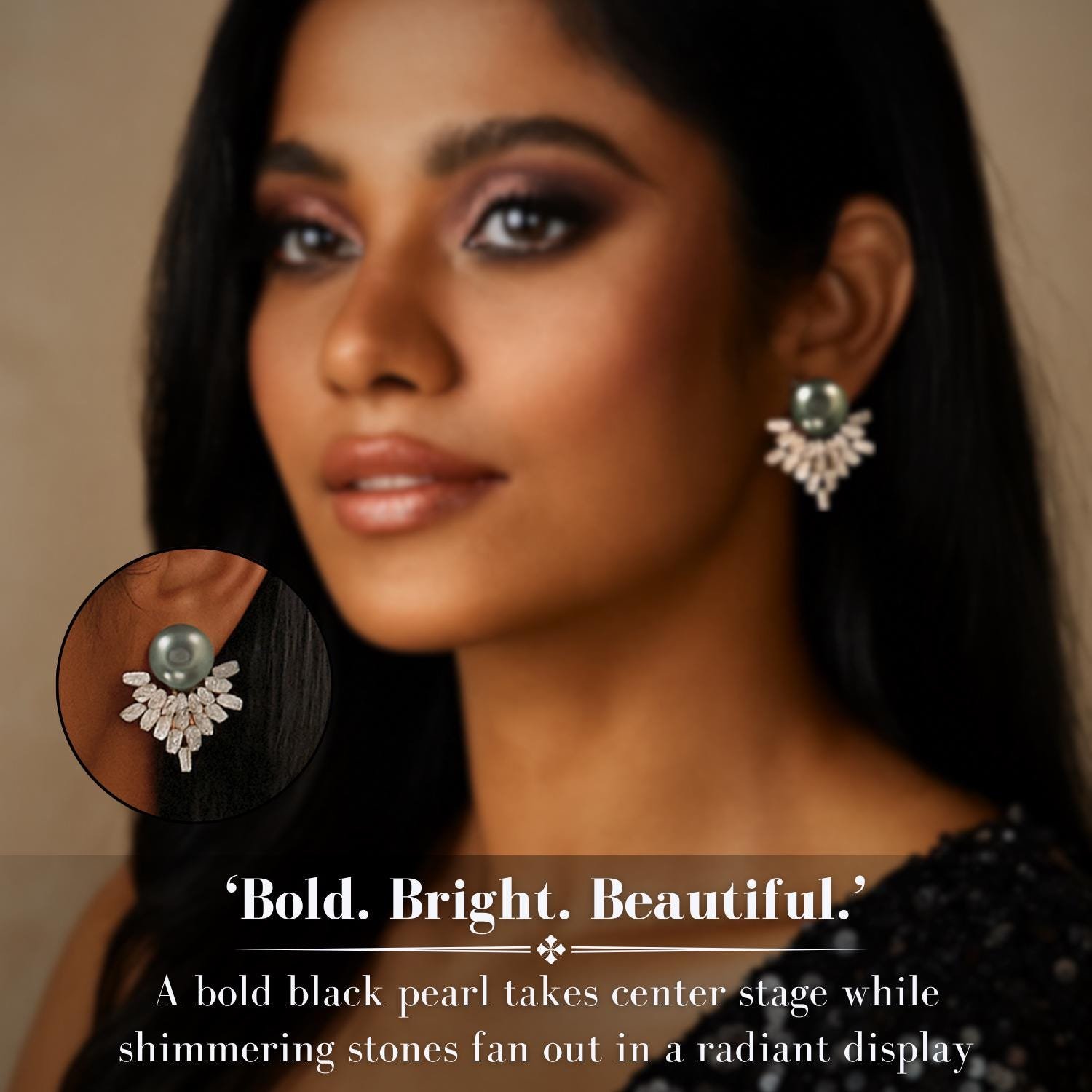 Elegant Black Pearl & Crystal Fan Earrings – Luxury Statement Studs for Weddings, Parties And Evening Glam – Timeless Designer Jewellery