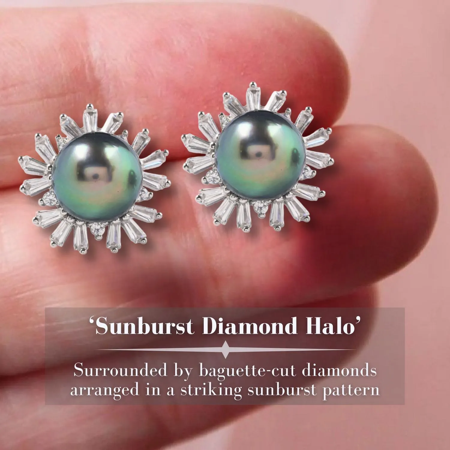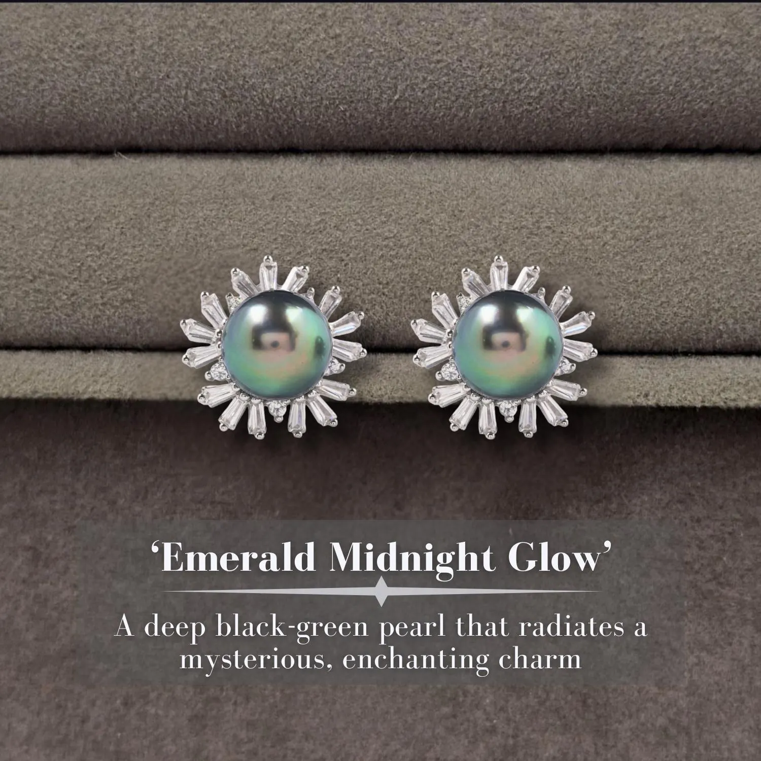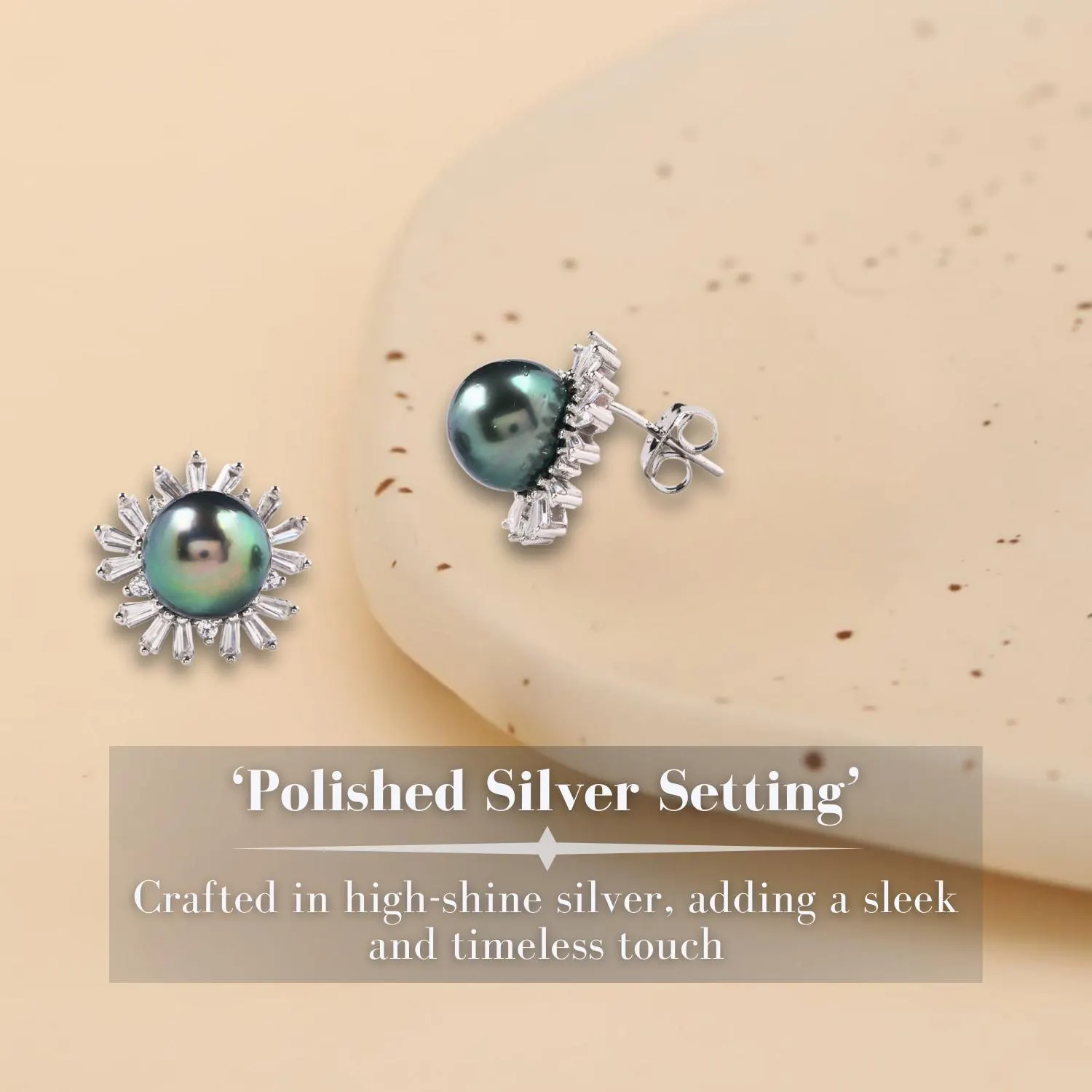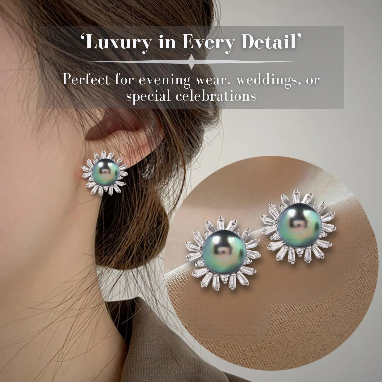 Elegant Black Pearl Sunburst Stud Earrings, Sterling Silver & Cubic Zirconia, Minimalist Bridal Jewellery Gift for Her