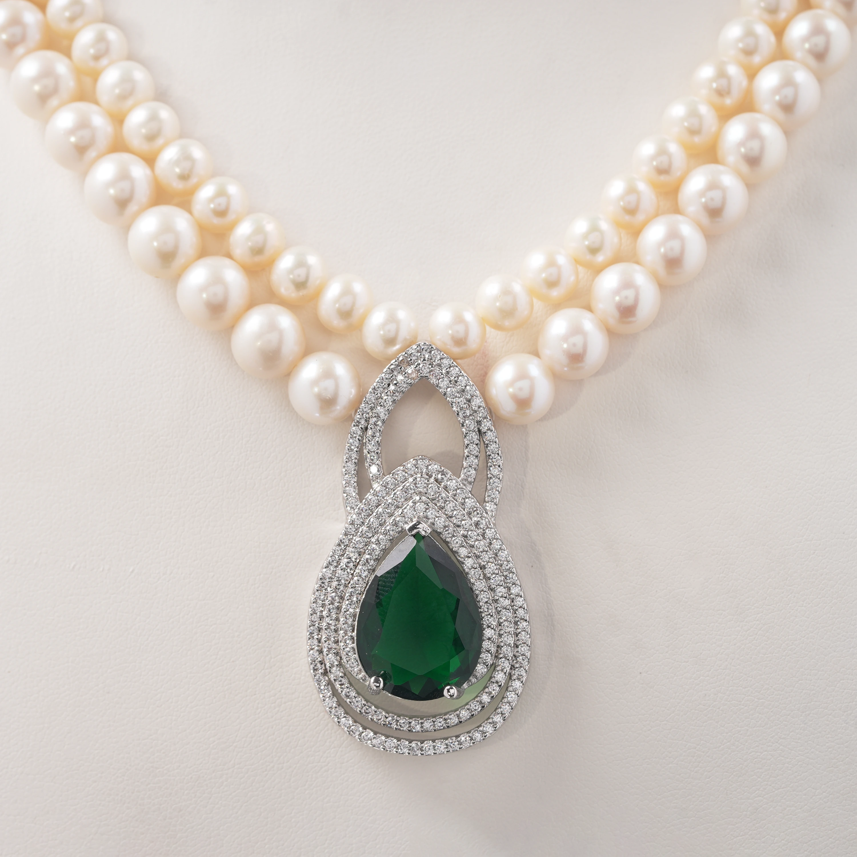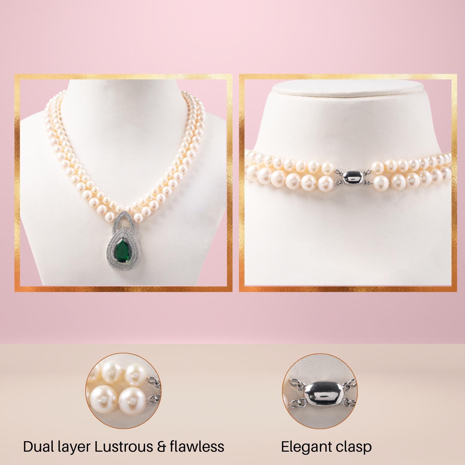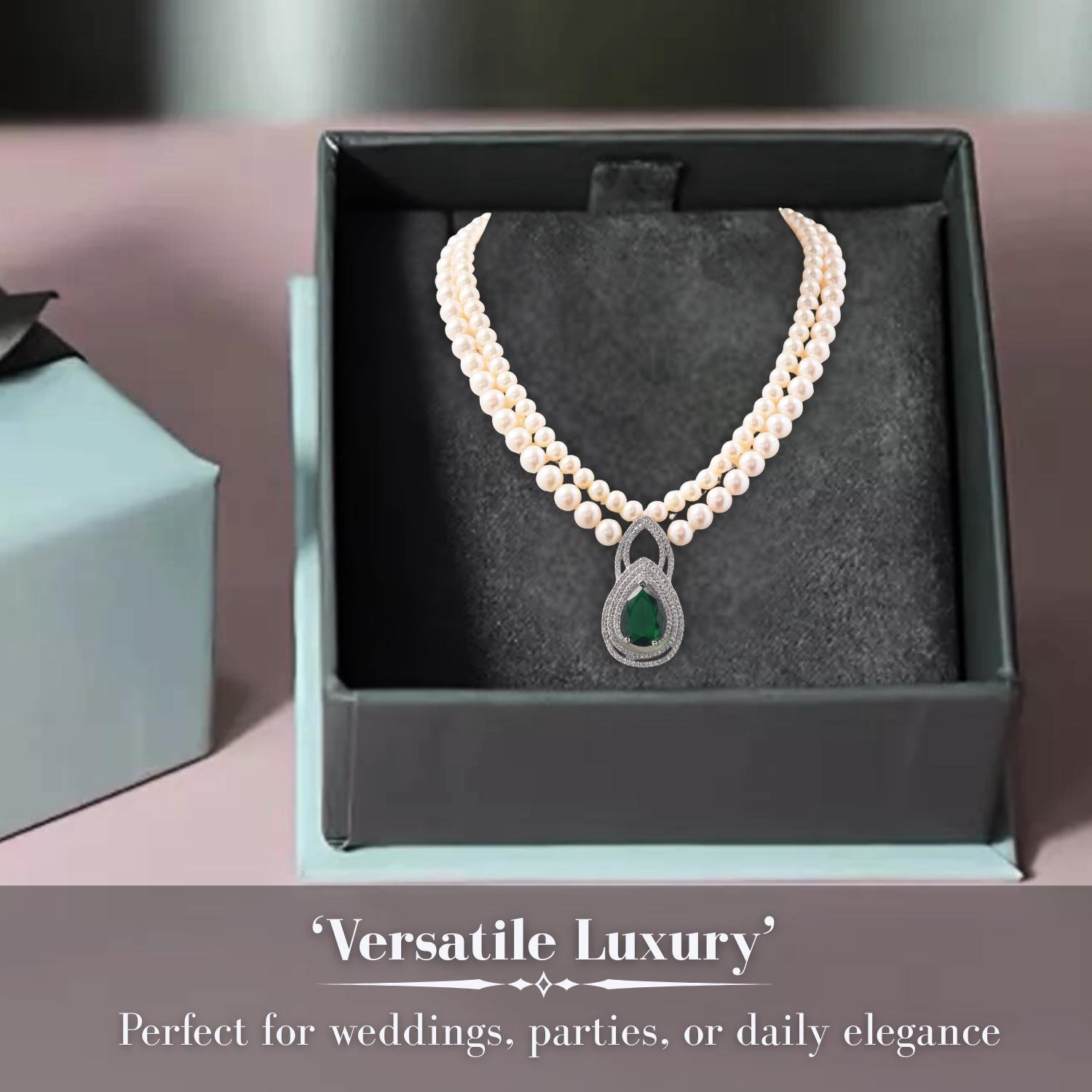 Elegant Double Strand Pearl Necklace with Green Teardrop Pendant, Bridal Jewellery, Classic Pearl Choker for Women