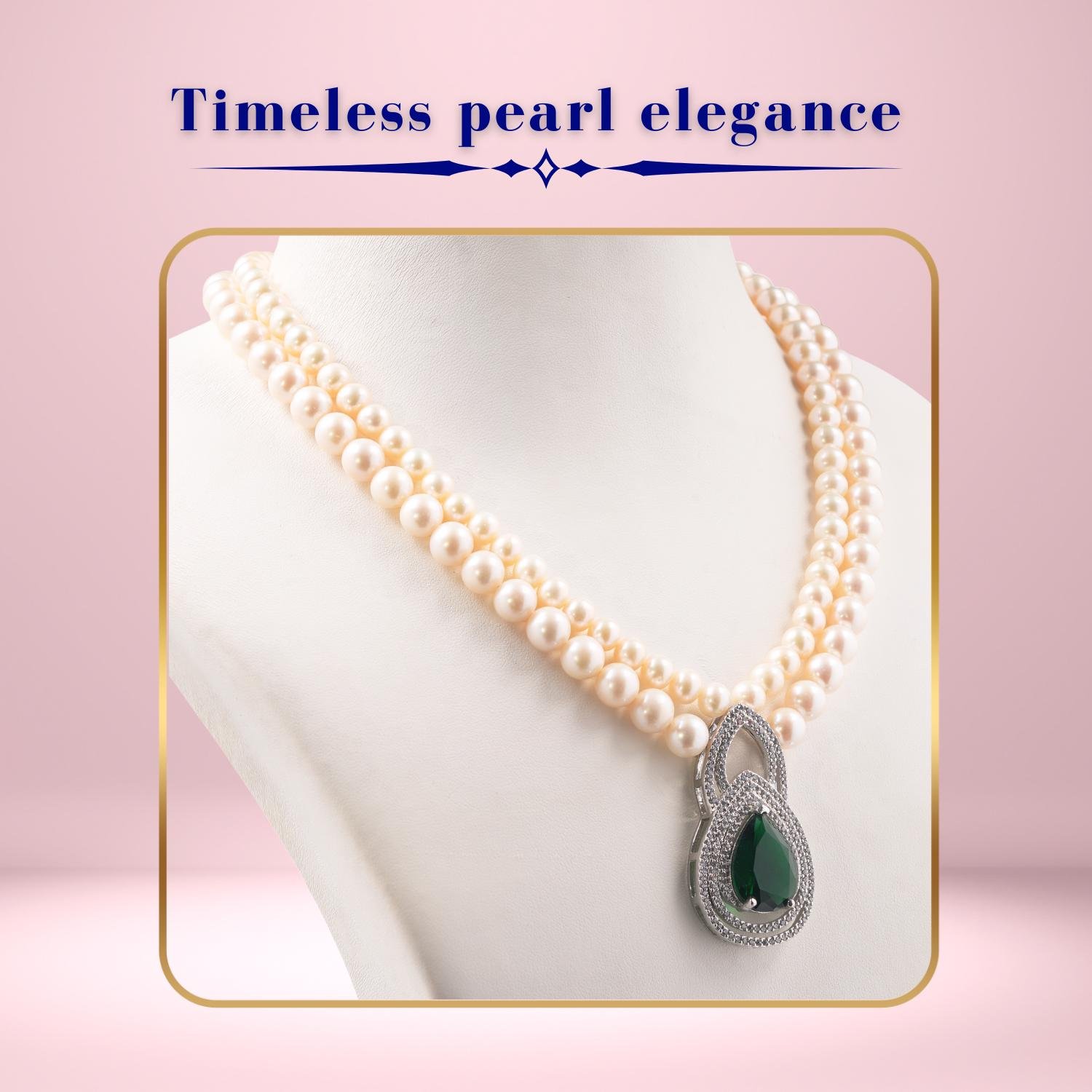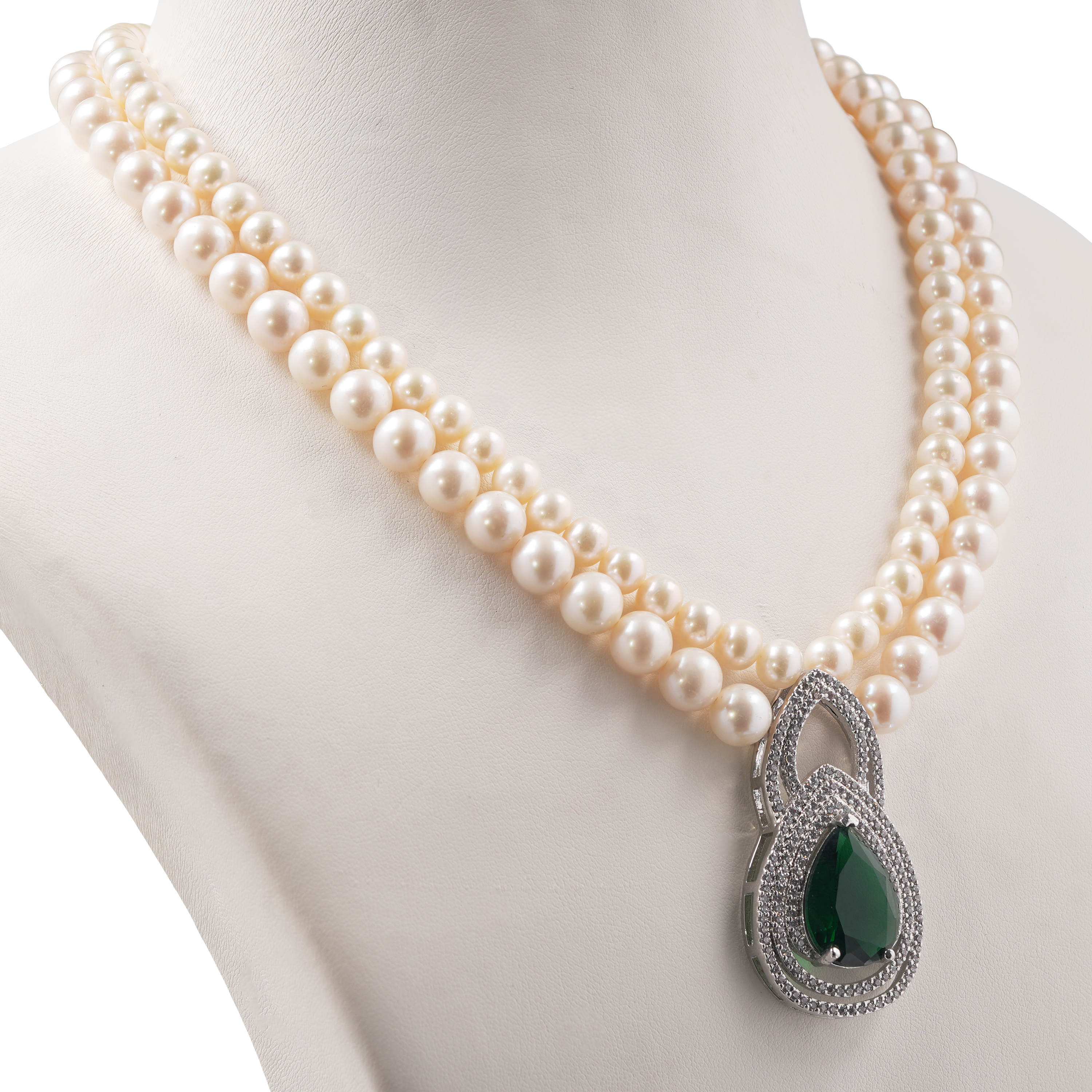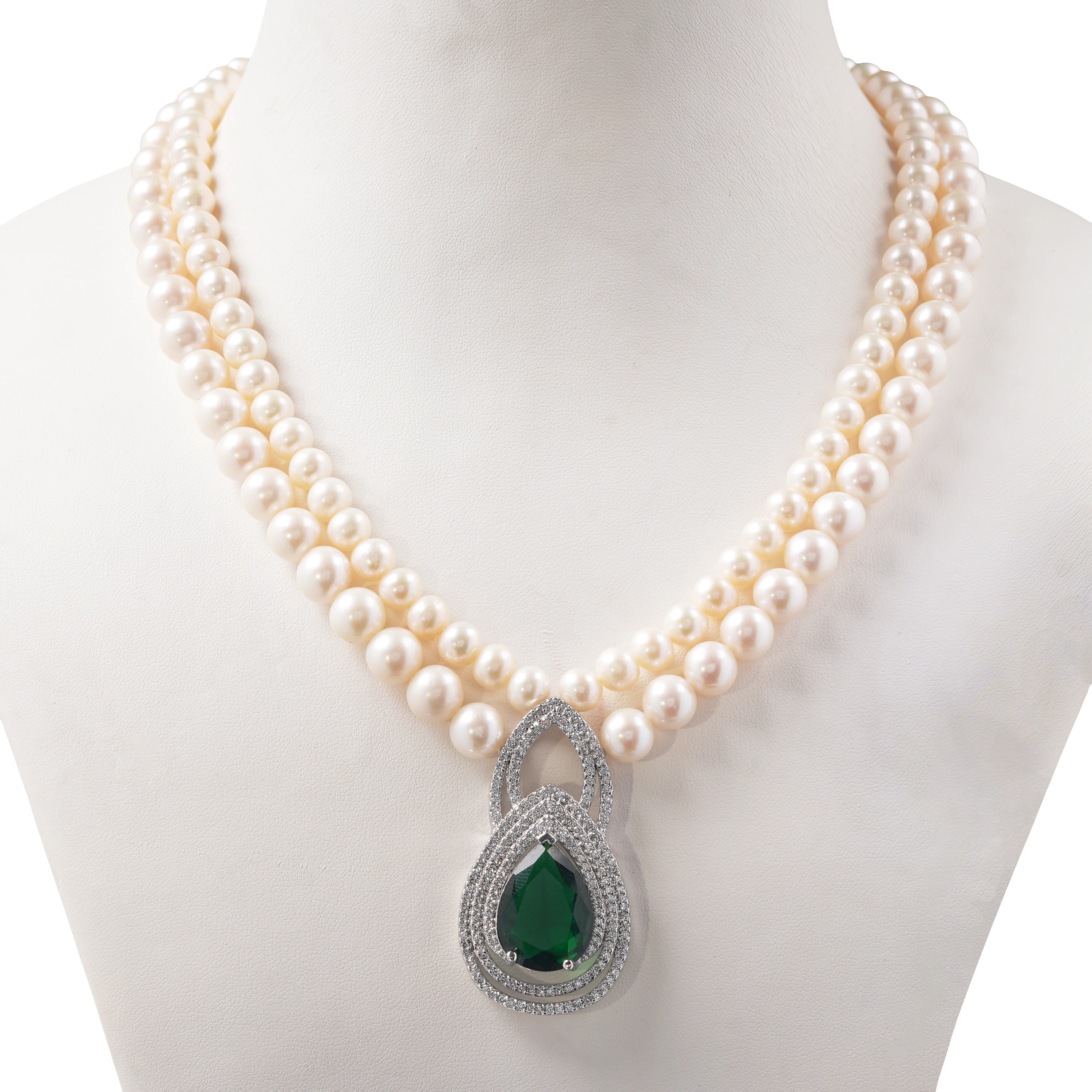 Elegant Double Strand Pearl Necklace with Green Teardrop Pendant, Bridal Jewellery, Classic Pearl Choker for Women