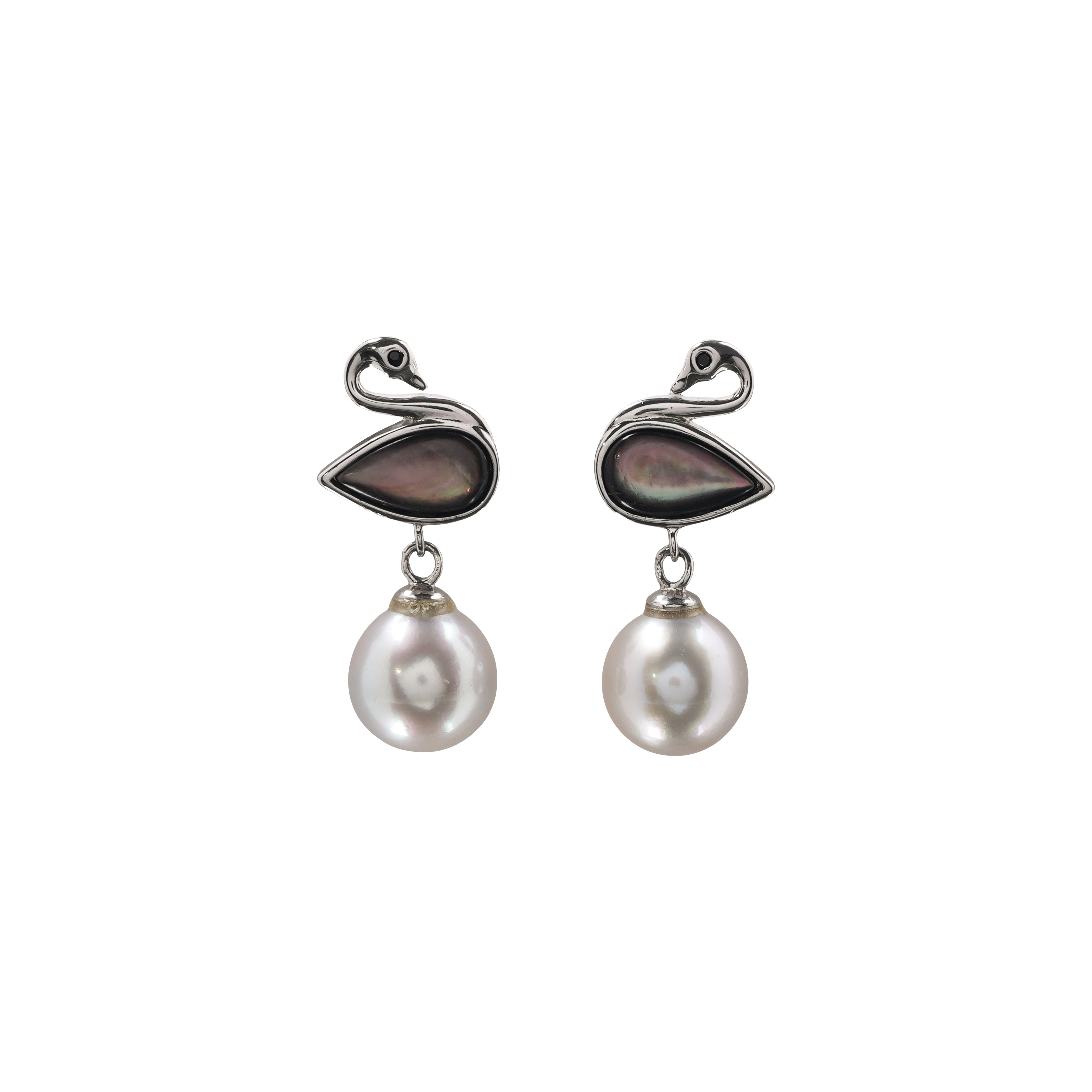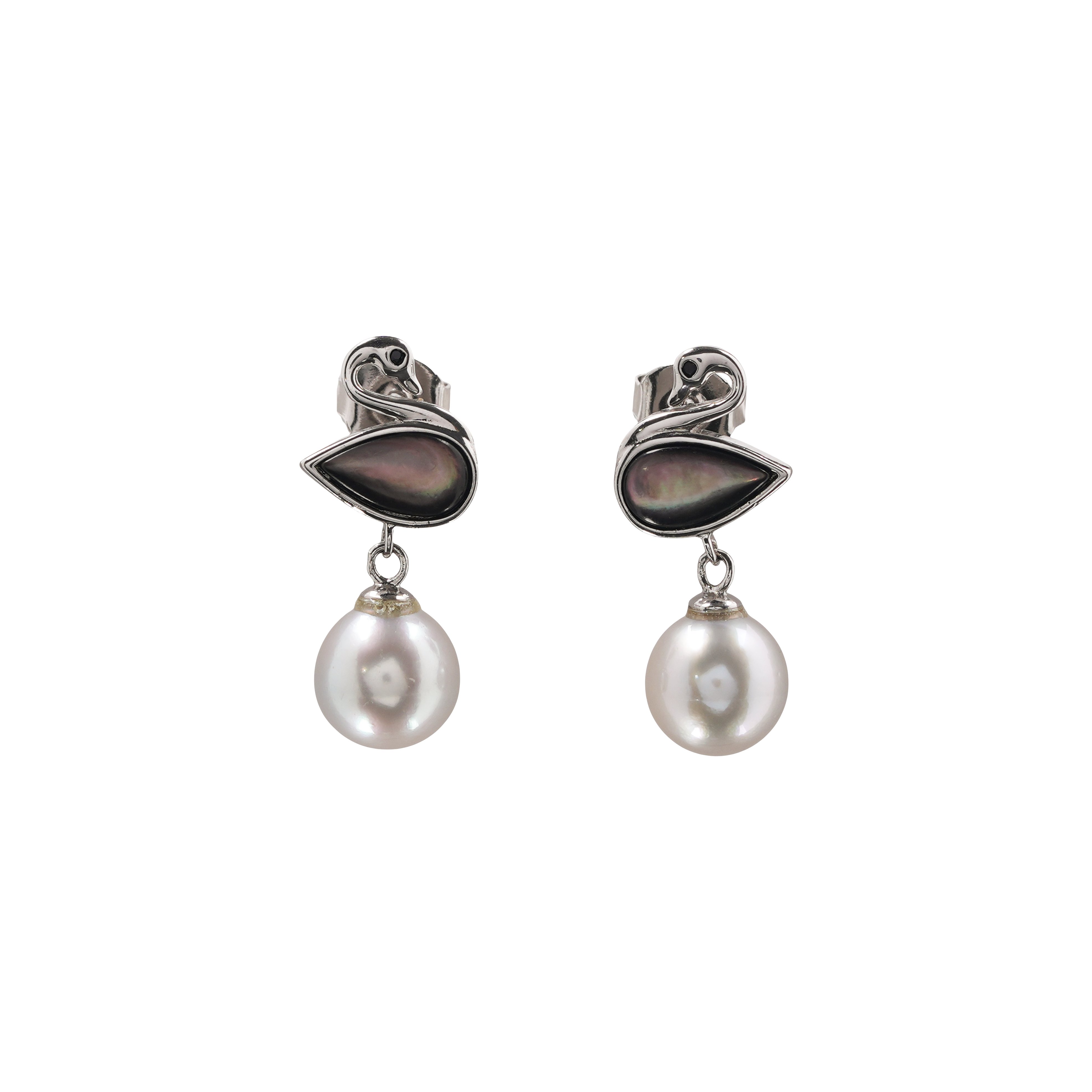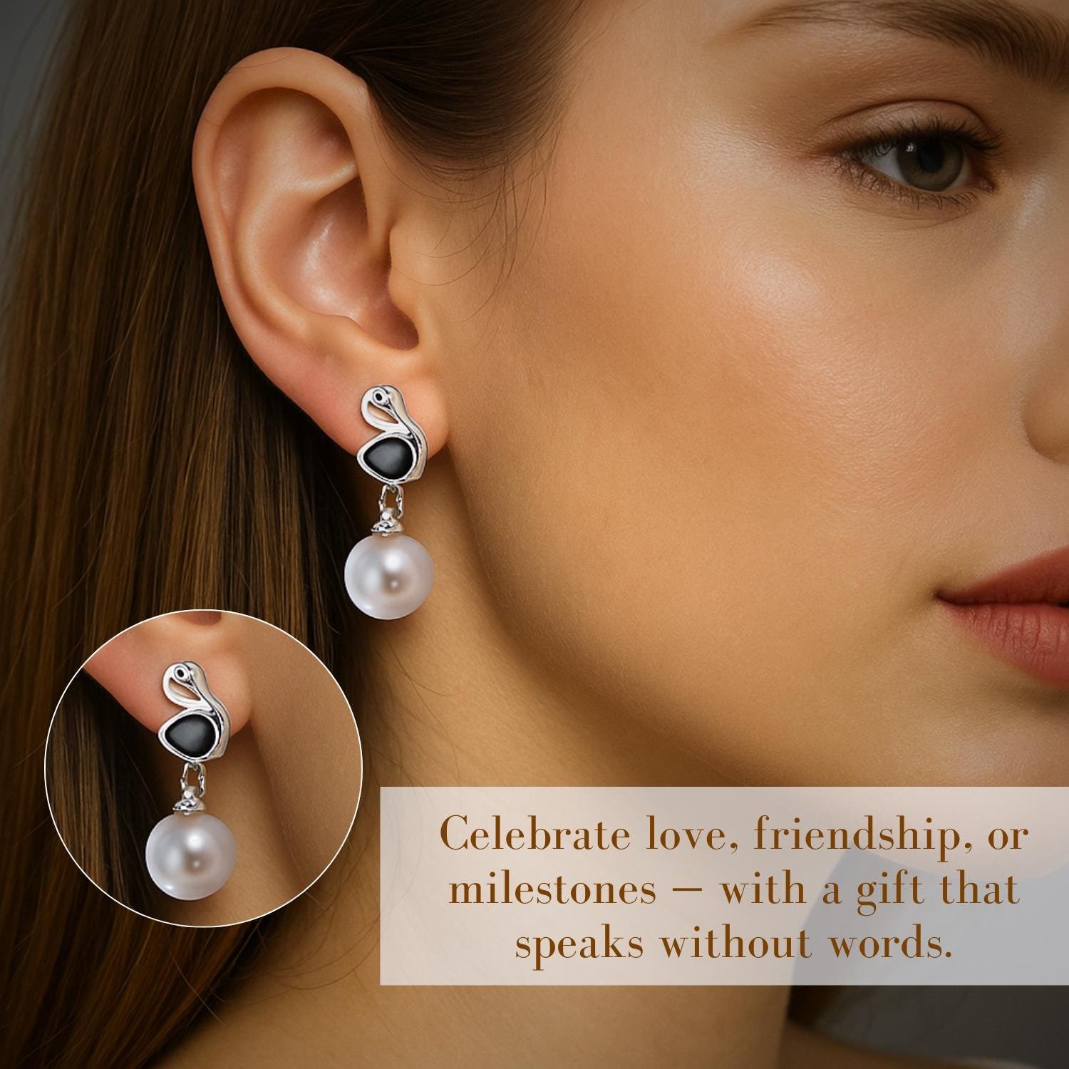 Elegant Swan Pearl Drop Earrings – Sterling Silver Bird Design with Black Mother of Pearl & White Pearl Dangle Jewelry for Women