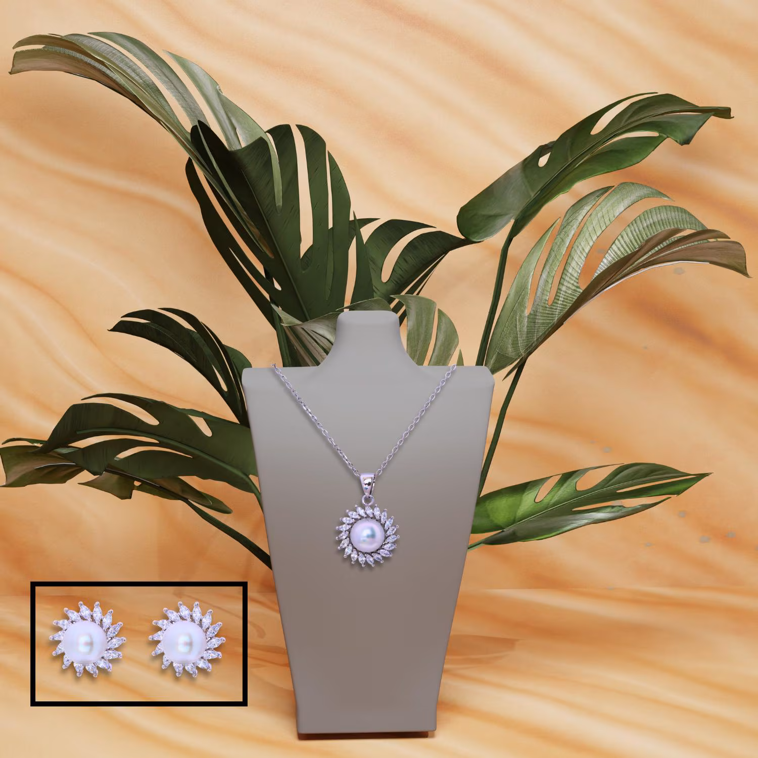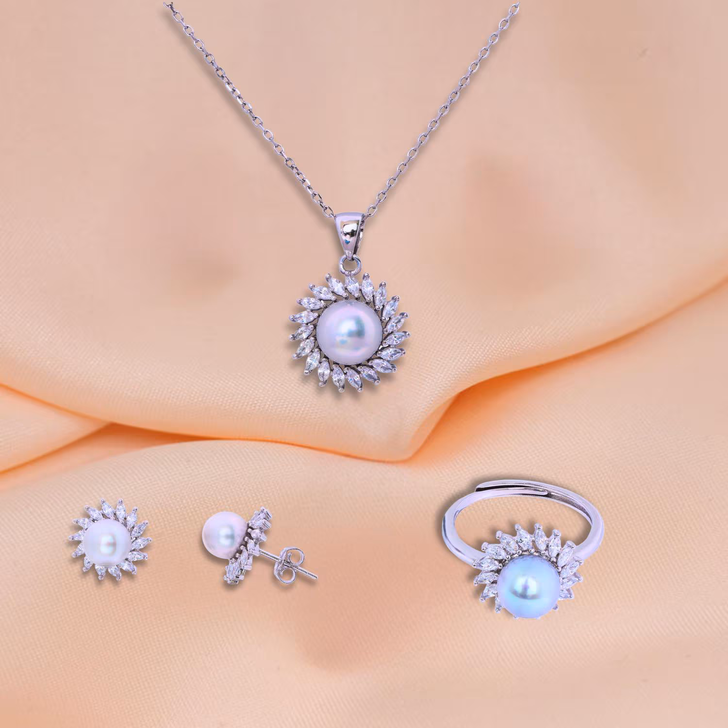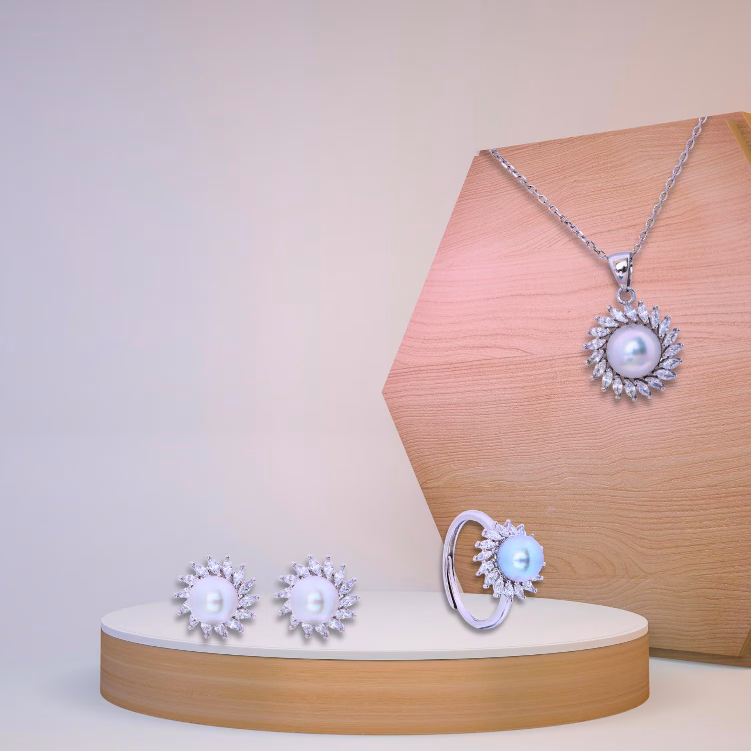 Polar Glow collection brings a pendant, earrings, and a ring in frosted silver with gentle pearl shimmer. Perfect for winter gatherings, evening dinners, or elevating everyday elegance to casual wear, this set feels timeless, refined, and endlessly wearable without losing its charm.