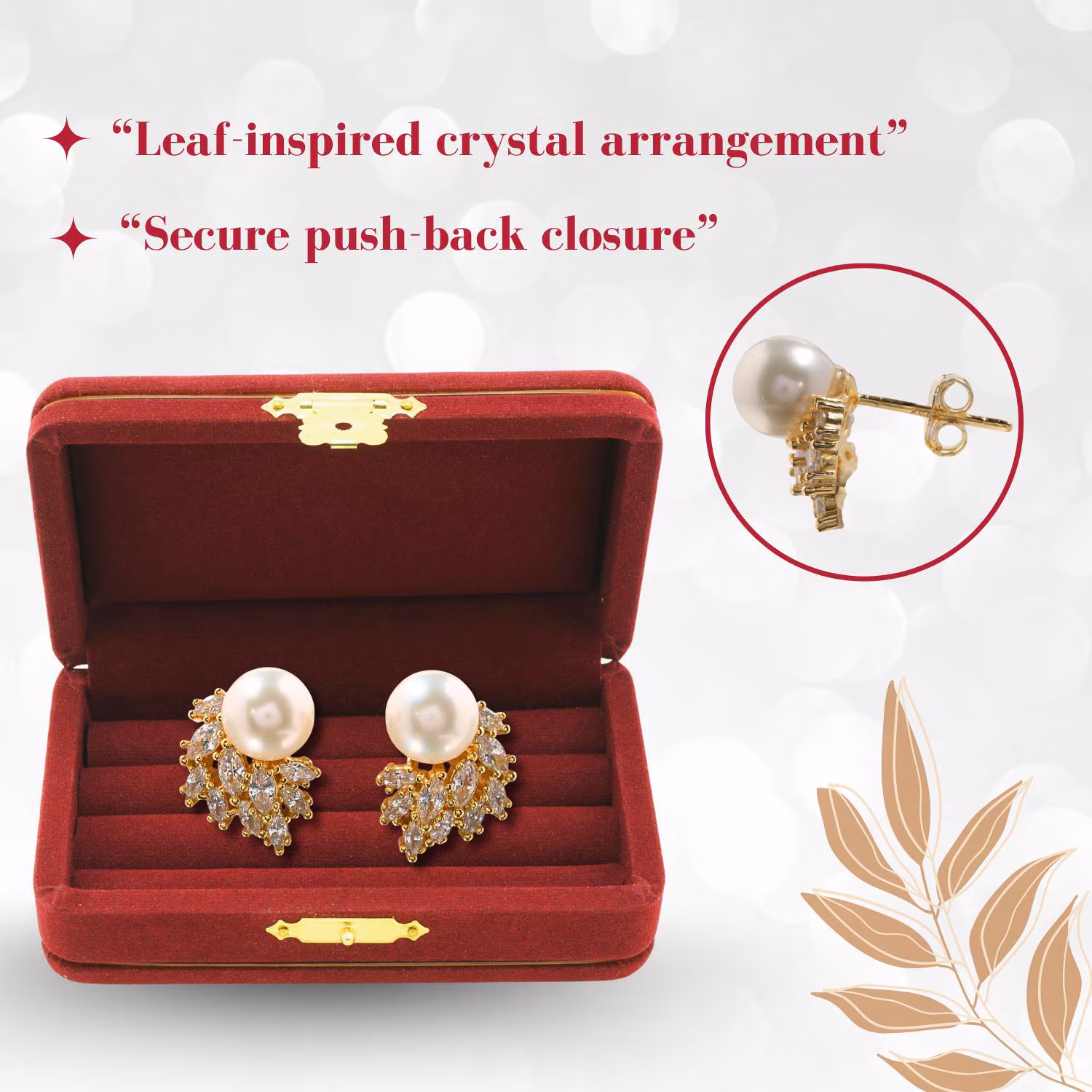 Gold Pearl Stud Earrings with Crystal Leaf Design, Elegant Bridal Jewellery, Luxury Wedding Earrings, Anniversary Gift for Women.