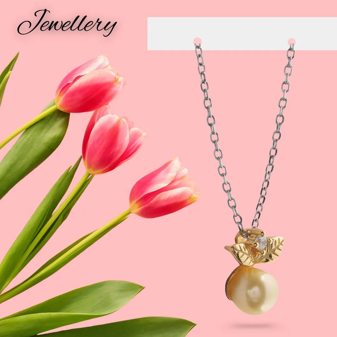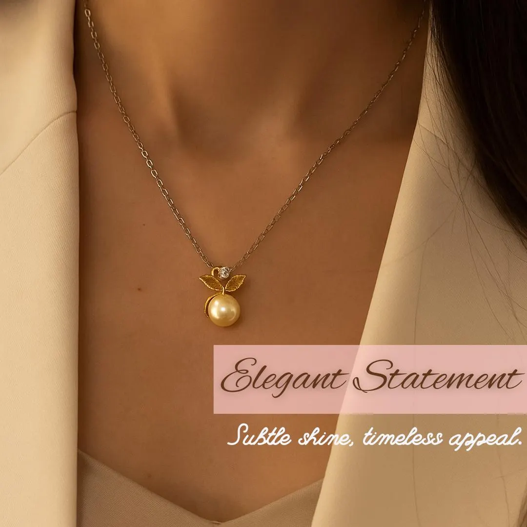 Golden Pearl Pendant Necklace, Sterling Silver Chain with Leaf Design & Crystal Accent, Elegant Jewellery Gift for Her