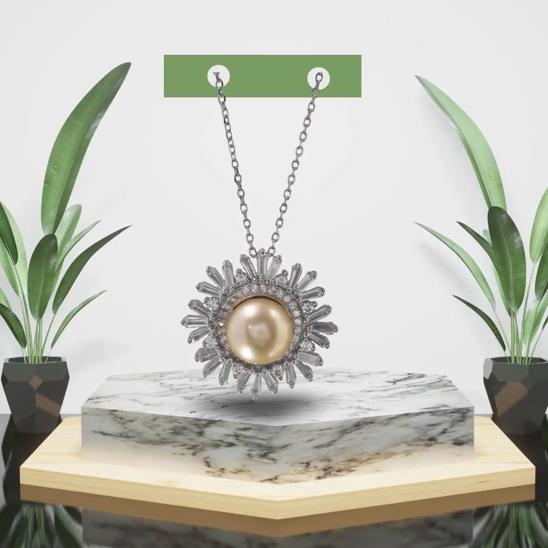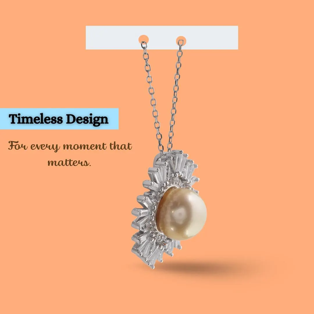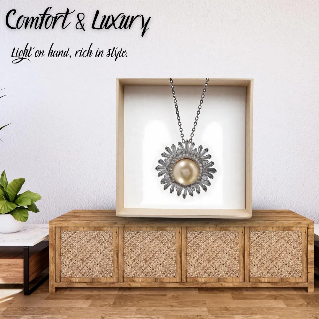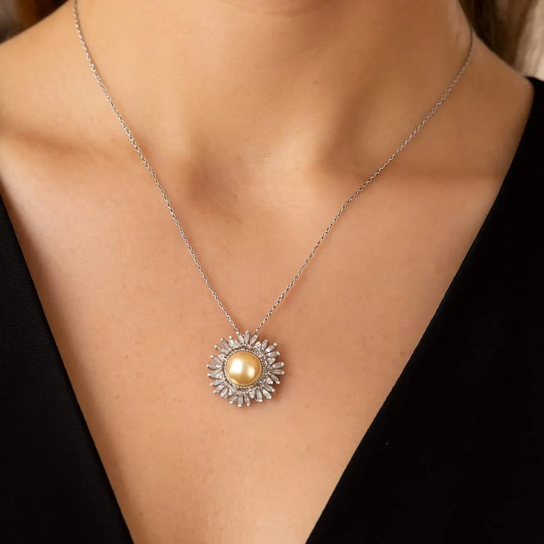 Golden Pearl Sunburst Pendant Necklace, Sterling Silver with Crystal Accents, Elegant Statement Jewellery Gift for Women