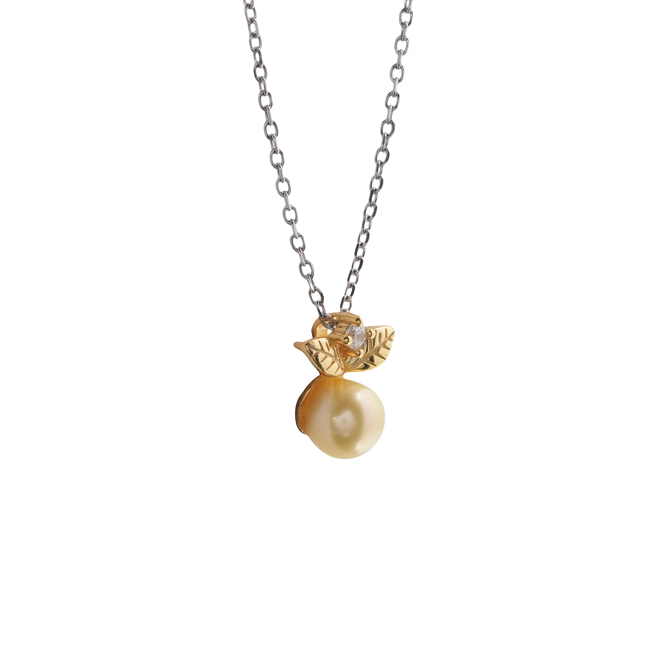 Golden Pearl Pendant Necklace, Sterling Silver Chain with Leaf Design & Crystal Accent, Elegant Jewellery Gift for Her