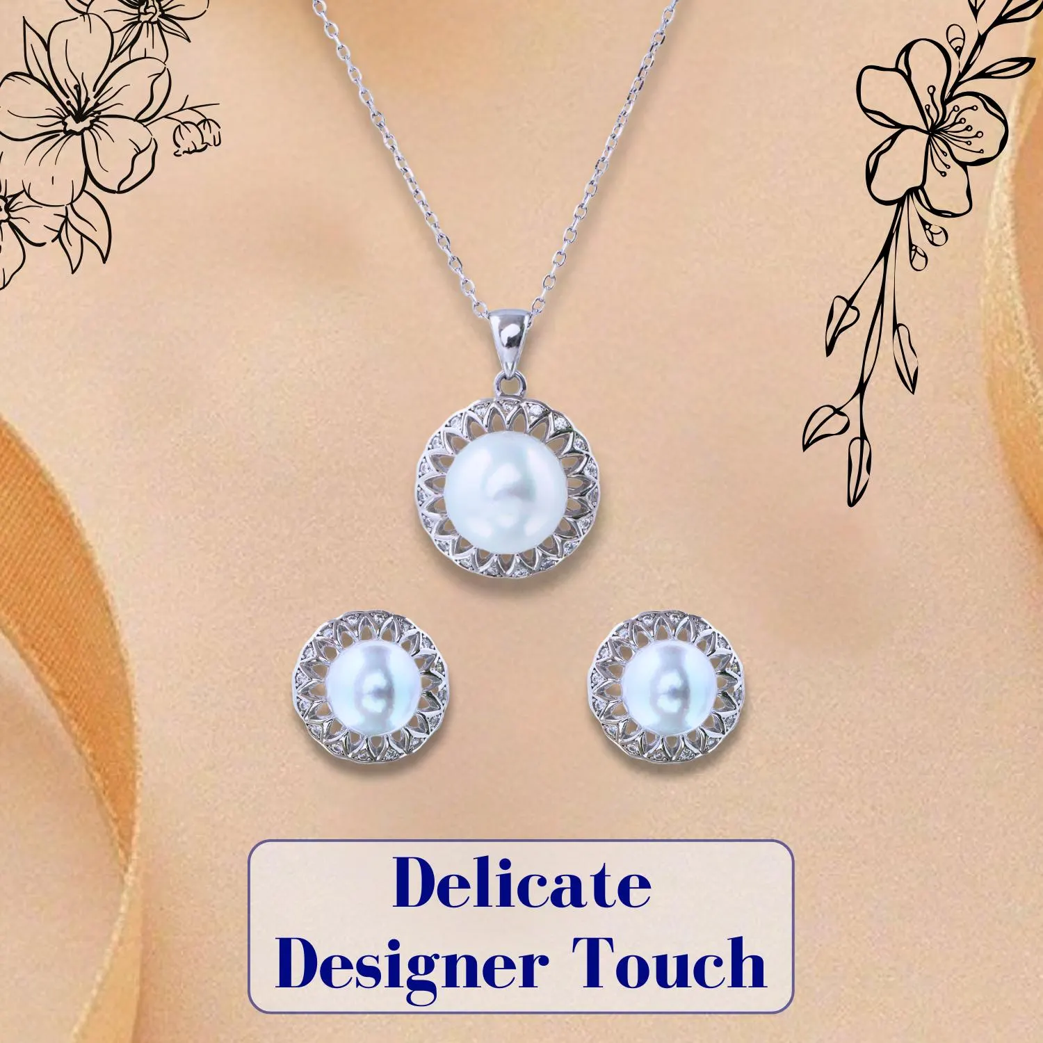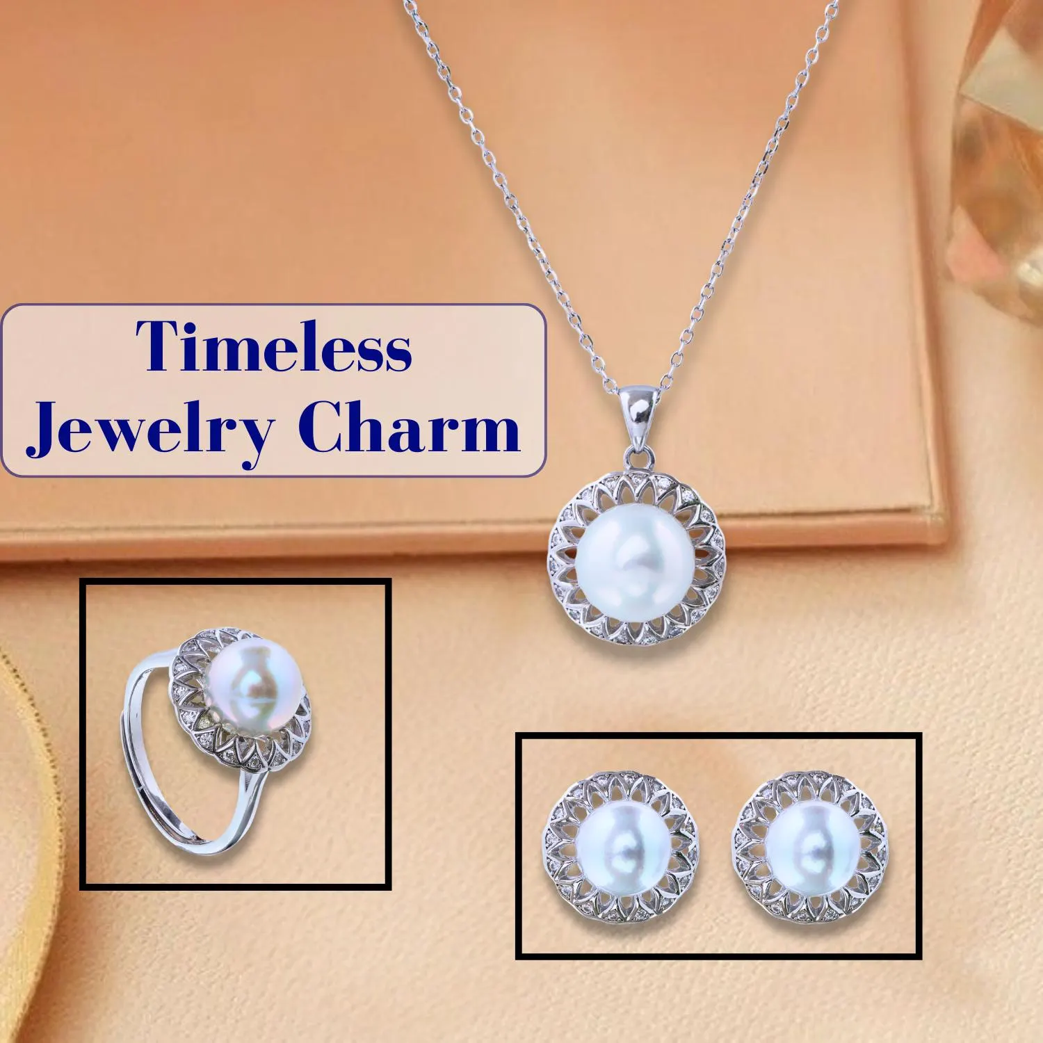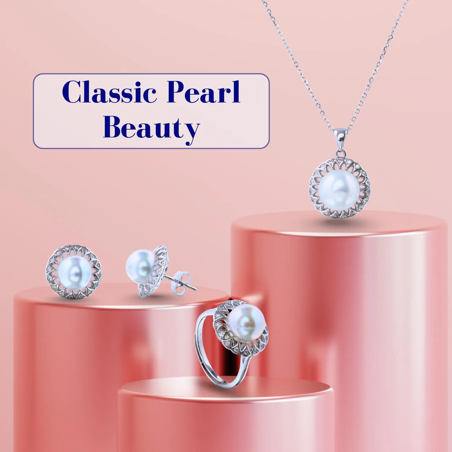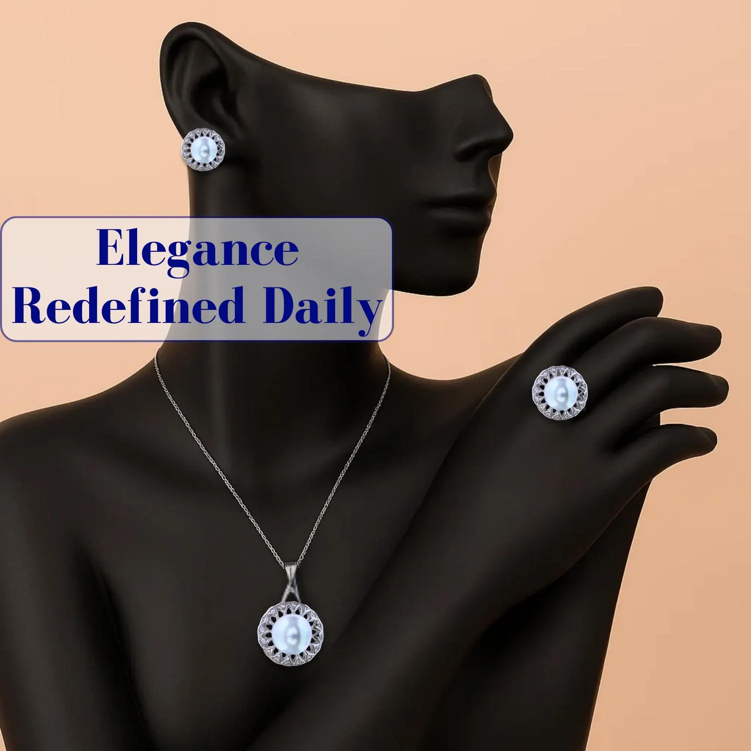 Laurelia White Glow collection presents a pendant, earrings, and a ring in bright silver, adorned with delicate white pearls. Perfect for weddings, celebrations, or elegant day looks, it offers serenity and sophistication. A piece that conveys a timeless style, enduring elegance, effortlessly across seasons and trends.