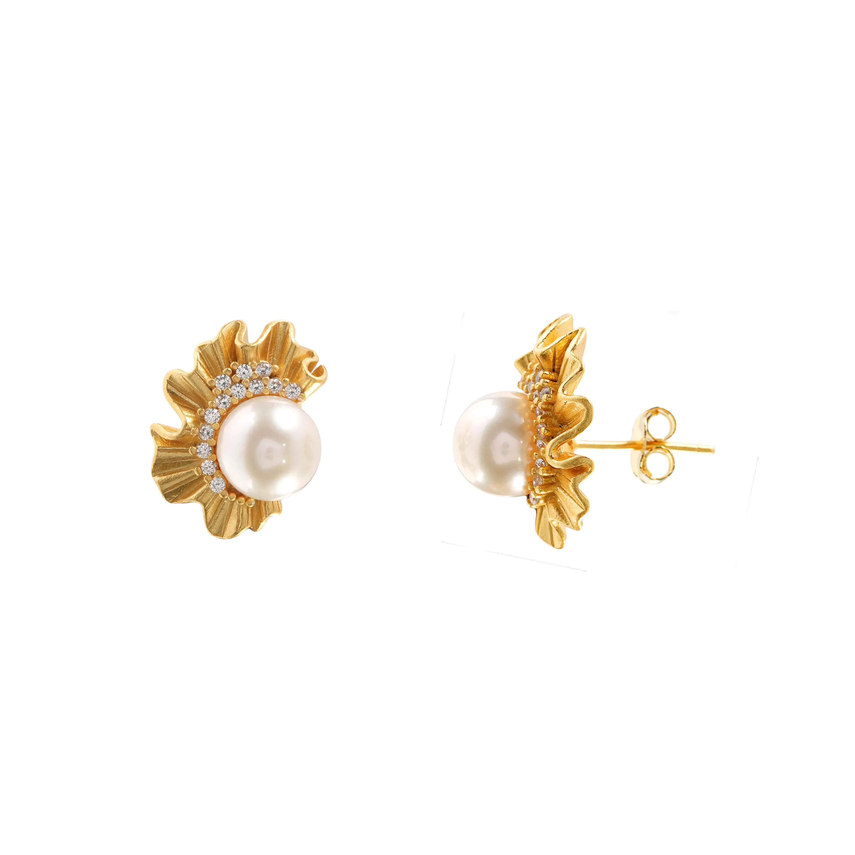 Vintage Style Akoya Pearl Earrings, Gold Sunburst Studs with Sparkling Stones, Timeless Jewellery for Women