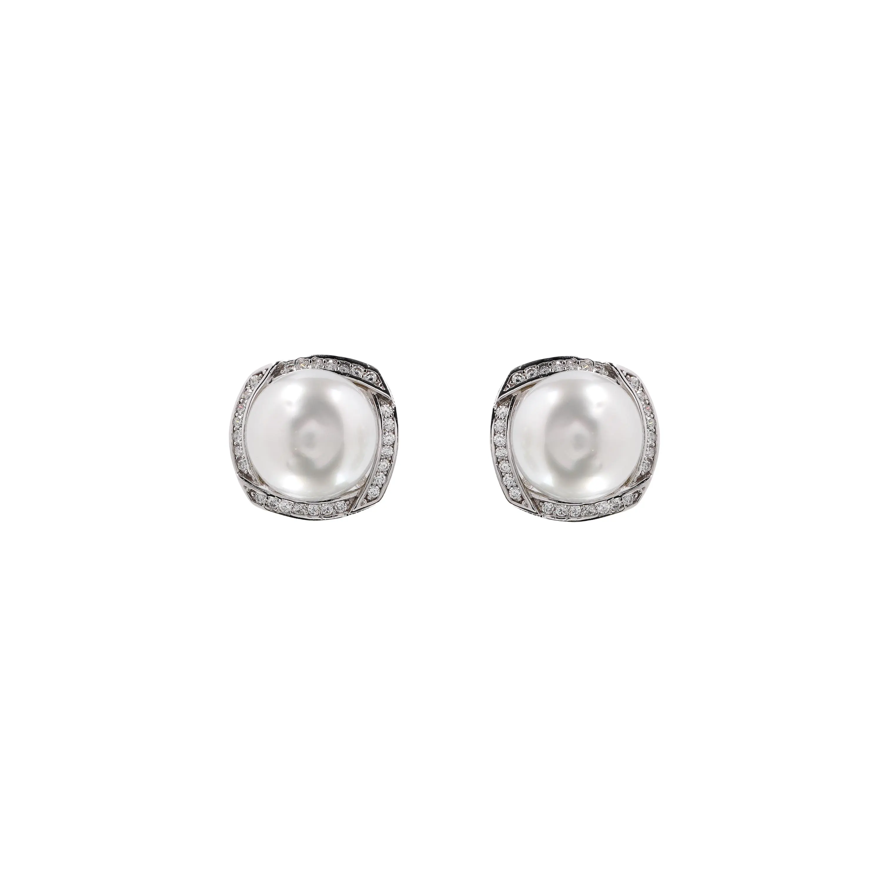 White Akoya Pearl Stud Earrings, Sterling Silver Halo Design with Crystals, Timeless Jewellery Gift For Her